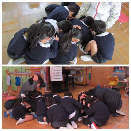 子どもたちは放送をよく聞いて,すぐに先生の近くに集まり頭を守る体勢を取っていました。