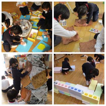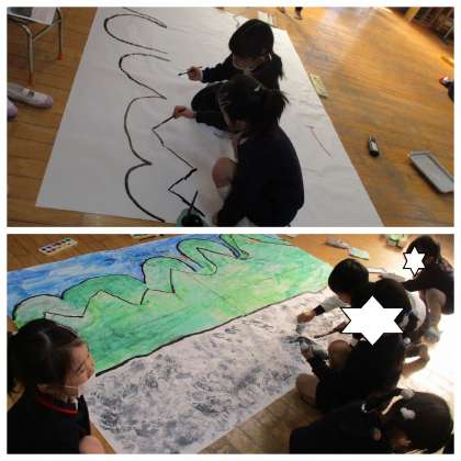 今日のそら組☆1 公開日 2022/01/20 更新日 2022/01/20 保育の様子 お話の世界で遊んでいますが、遊びの中で必要なものも考え作り出しています☆ 模造紙いっぱいに情景を思い浮かべ描いたあとは、色をぬりました(^▽^)/ お話の世界に出てくる囲炉裏の形を考え工夫してつくる姿も・・ さあ、明日はどんなお話になるかな・・♪