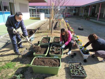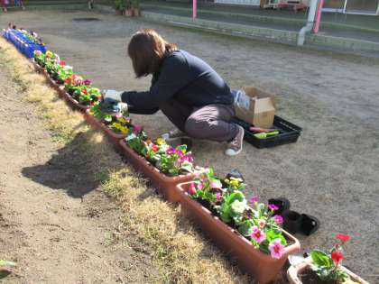 今日は日中暖かかったので,子どもたちがチューリップを植えた後先生方でお花をたくさん植えました。
