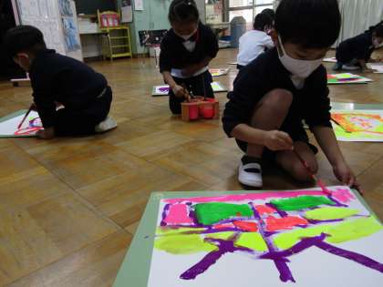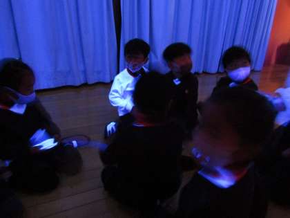 今日は劇遊びの小物作りをしました。舞台の中でブラックライトをつけると白い色が光ります!「うわ〜」「光った!」とびっくりしていました。蛍光色で絵を描いたり・・・・いったいどんなものができるでしょうか?お楽しみに☆彡