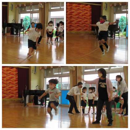 縄の真ん中で止まって1回ジャンプし、走り抜けます!「止まってジャンプ」のタイミングや体の向きなどがうまくいかずに引っかかってしまうことも多かったですが、繰り返すうちに徐々にコツをつかんでいき上手に跳ぶ子も増えていきました。