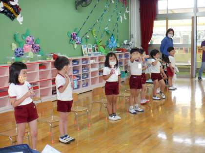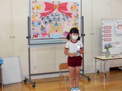 休園でずっと延期になっていた,4月生まれの誕生会をしました。自分で作ったマイクを使って,司会も頑張っていました。