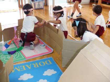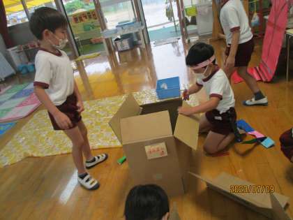 友達と協力して、扉をつけたり部屋を広くしたりして、素敵なおうちを考えていましたよ。