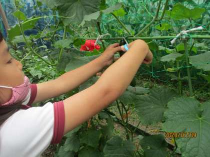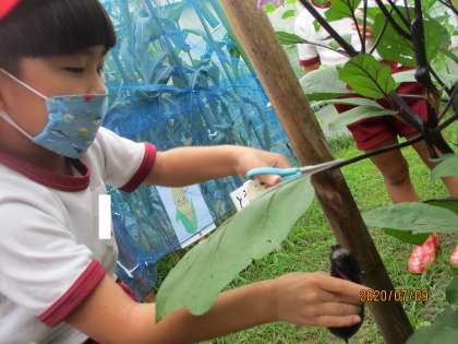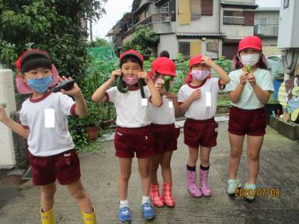 雨の止み間に畑へ夏野菜の様子を見に行きました。「やっばり大きくなってたよ」「これはちょっと小さいから明日までおいておこう」など,野菜を見て収穫の時期を自分たちで分かるようになってきました。おうちで美味しくいただいてくださいね。