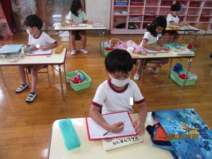 絵本の表紙をよく見ながら、真似て書くことで文字への興味が広がったり、読める文字が増えたりしています。
