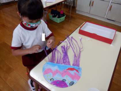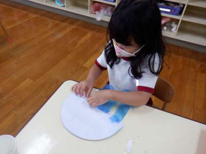 たんぽぽ組さんは、昨日色をつけたクラゲに脚をつけました。