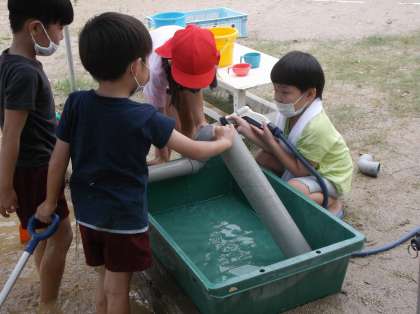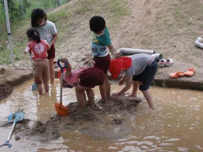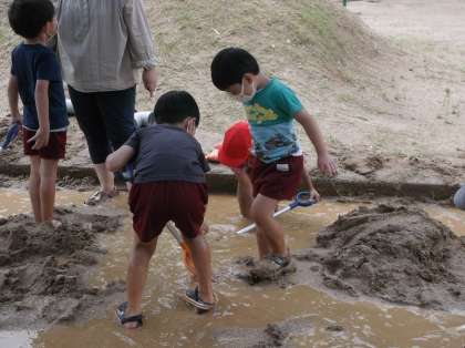 雨が上がってたので,砂場で泥んこ遊びをしました。砂場を泥んこプールにしよう!とみんなで砂を掘ったり,水を流したりして存分に水と泥の感触を楽しんでいました。
