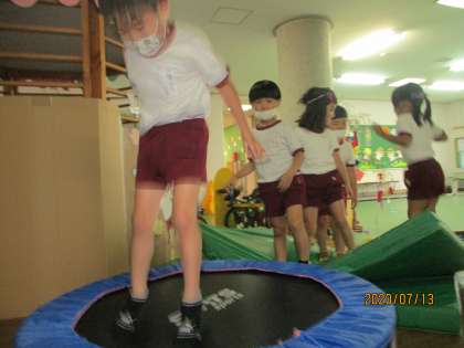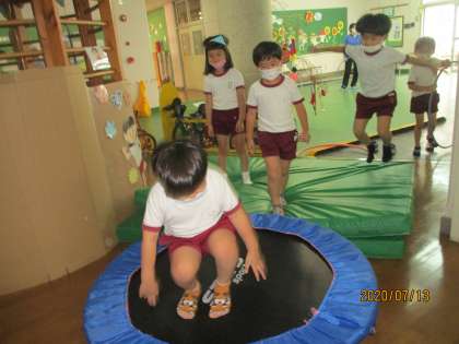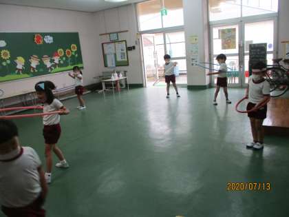 雨が降り続いていたので,外遊びができませんでしたが,玄関ホールでフラフープやトランポリンで遊びました。フープで2本回しや3本回しをするなど難しい技にも挑戦していましたよ。