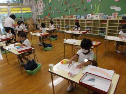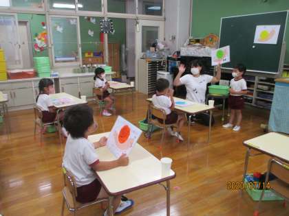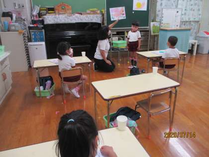 みんなの前に立つのは、まだ少し恥ずかしいお友達もいるようですが、自分の考えや思いをしっかりと表現できるように、少しずつ友達の前で話す経験や友達の話を聞く経験も積み重ねていきたいと思います。