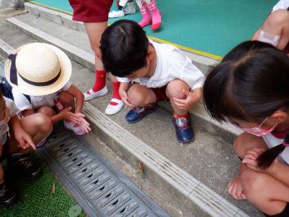 「先生!白いセミがいるよ」と大興奮して教えてくれました。ばら組の保育室の前でセミが羽化している真っ最中!「きれいな色だね」みんなが集まってきて興味津々で見入っていました。