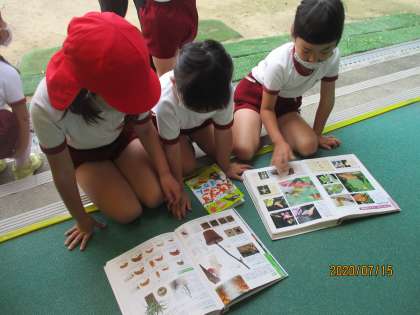 図鑑を持ってきて,「これや!これと一緒だよ」と見比べたり,「セミの穴はどこかな?」と言ってセミの穴探したりしていました。