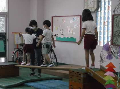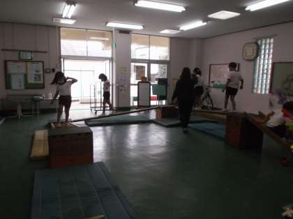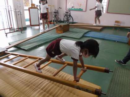 久しぶりに巧技台で遊びました。年長児になったので自分たちで,遊具をどう繋げるか考えて,みんなで協力して遊具を設定しました。存分に体の色々な部位を動かして運動遊びを楽しみました。