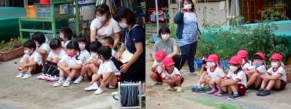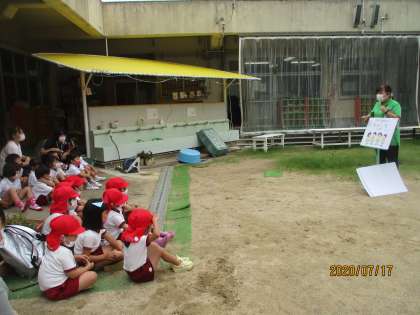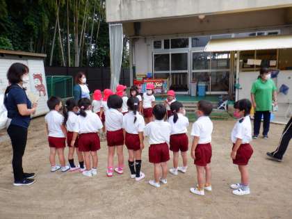 6月は年長さんのみが避難し、その様子を年少さんが見学するかたちで行いましたが、今回は全員が放送をよく聞いて避難をしました。