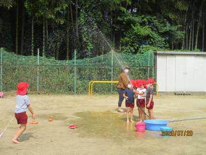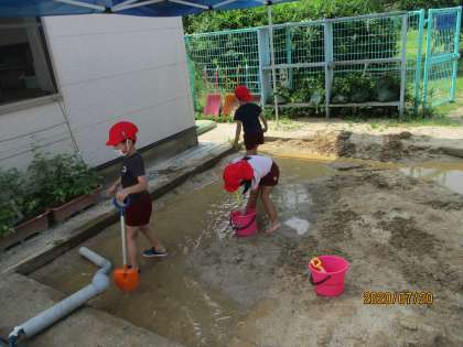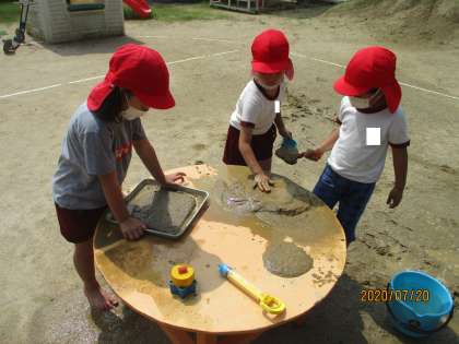 今日は朝からいい天気!裸足になって泥んこ遊びを楽しみました。水やどろの心地よさを存分に味わっていました。幼児期に感触遊びをすることで大脳が刺激され,五感が発達します。