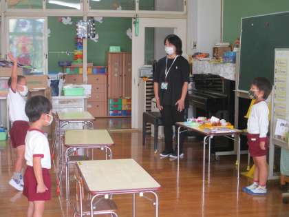 お当番活動を始めました。朝の会では、司会をしています。お友だちの名前を呼んだり、欠席調べをしたり、お弁当を食べる時には挨拶をしています。