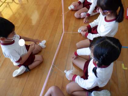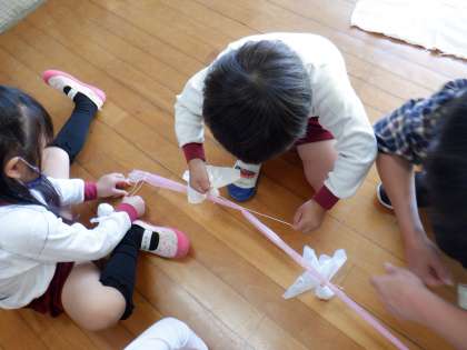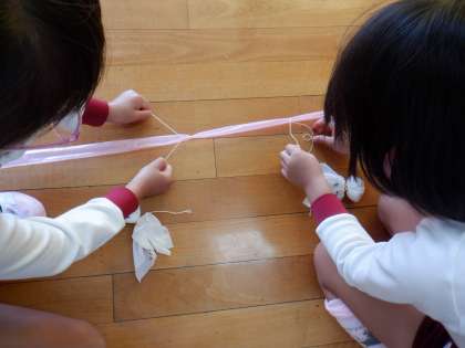 初めての園外保育を楽しみにしているたんぽぽ組さん。「雨が降りませんように!」と、てるてる坊主を作りました。お天気になるといいね。