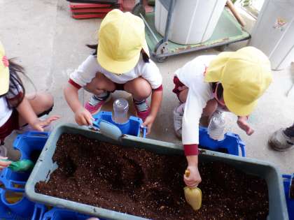 種を植えたら「おおきくなーれ!」とお水をかけていましたよ。20日〜40日で収穫できるんですって。楽しみですね。