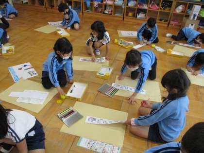 またお部屋では1年間描いた絵や作品を持ち帰るための作品袋の準備をしました。
