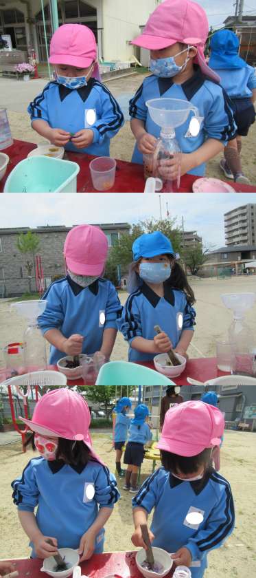 外遊びでは砂場でお料理をしたりスケーターや遊具で遊びました。すみれ組さんがお花の色水遊びをしている姿に興味をもち見ていると「一緒にする?」と誘ってくれて遊び方を優しく教えてくれました。お花からきれいな色が出てきてとても嬉しそう!良かったね!
