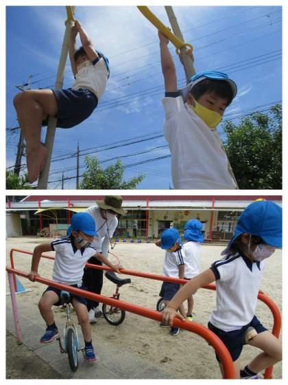 またチャレンジもみんなで頑張っています。登り棒やフラフープも上達してきました!友達が頑張っている姿に刺激を受けて、「やってみよう」と挑戦しています!友達からの「すごい!」の誉め言葉が何よりもパワーになっているようです。