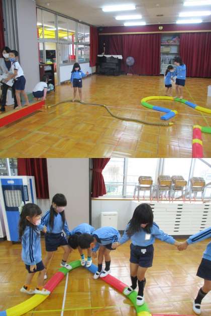 その後、忍者修行の一本橋にできそうなものを試してみました。「落ちたらまきびしが刺さるで」と言いながら慎重に渡ったり、友達と手をつないで支え合ったりしていました。「平均台は簡単すぎるなぁ」「綱は難しかったし、いいかも」「まきびしは何で作ろうかな?」また考えが膨らみます。いろいろな動物に変身の術を使ってリズムもしました。