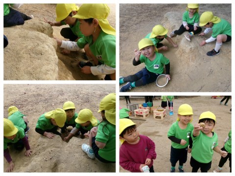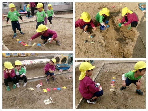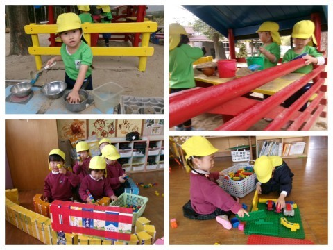 今日も戸外でいろいろな遊びを楽しみました。どんぐりを繰り返し転がしたり,友達とごっこ遊びをしながら遊んだりして楽しんでいます。