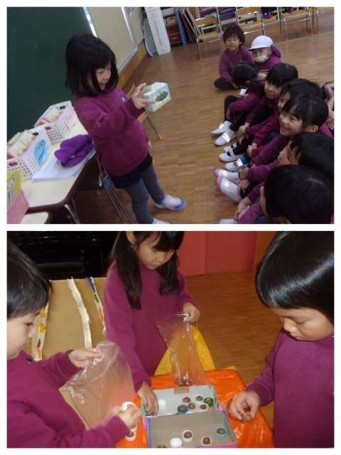 室内では好きな遊びの時間につくったどんぐりを使って『どんぐり屋さん』ごっこをしました。「いらっしゃいませ~」「どれがいいですか?」という言葉も自然と聞こえてきました。