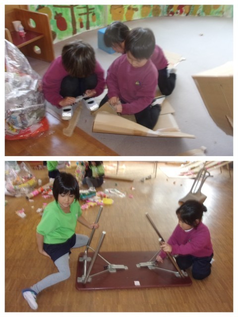 材料の箱の色を活かして「モササウルス」をつくったり、のぞくところが3つもある望遠鏡をつくったり。
