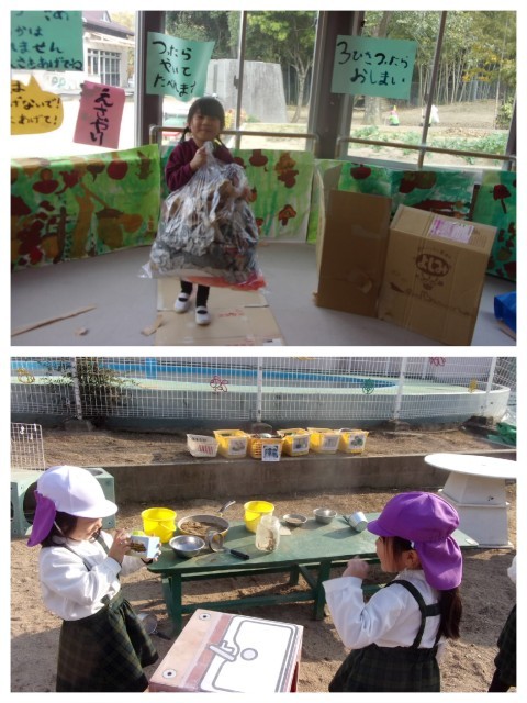 お料理作りをしたり,森でどんぐり転がしをしたりして遊んでいます。