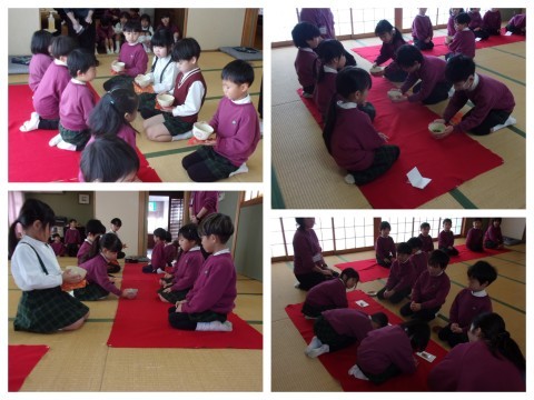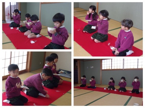 年長さんの招待を受け、ぶどう組さんが初めてのお茶会に参加しました。
