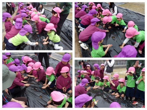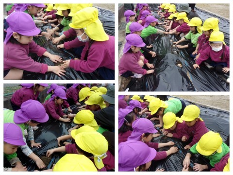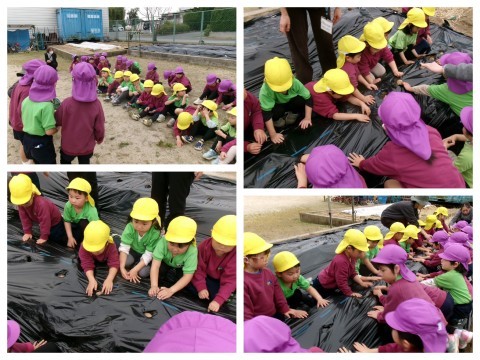 ぶどう組、きりん組、うさぎ組の子どもたちがじゃがいもの種芋を植えました。