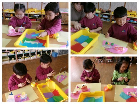 千代紙をしずくの形にしてのりで貼り付けて,烏帽子や冠を顔につけて完成です。二人並ぶ姿を「かわいい~」と嬉しそうに見る子どもたちでした。