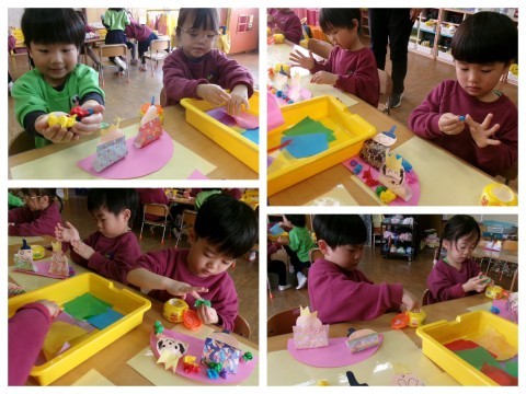 4歳児の子どもたちは、通常保育でペープサートの人形づくりを楽しんでいるようで、