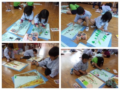 年長さんが、年中さんにお弁当の包み方を教えてくれていました♪