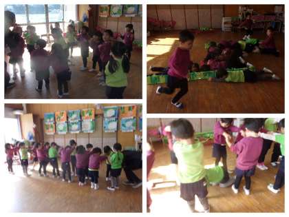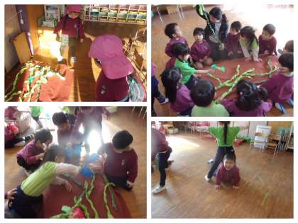 今日はサツマイモ畑に行く途中の森の広場でかくれんぼをして遊びました。「もういいかい?」「まーだだよ!」「○○ちゃんみーつけた♪」と友達とのかけ合いややり取りを楽しんでいました。森の広場の川を飛び越えたり、みんなで長いトンネルをつくってくぐりたい!」!という意見もあったので「どうしたら長いトンネルになるかな?」と考えて表現してみました。子どもたちの思いを取り入れながらごっこ遊びを楽しんでいこうと考えています☆
