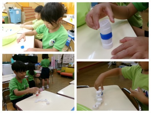 今日もペットボトルの蓋で遊び始めたこどもたち。