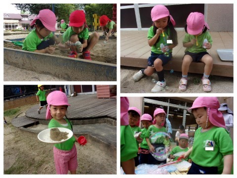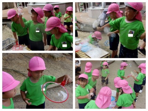ふわふわと漂う様子をじっと見たり,大きいシャボン玉をつくろうと試したりと,繰り返し楽しんでいました。