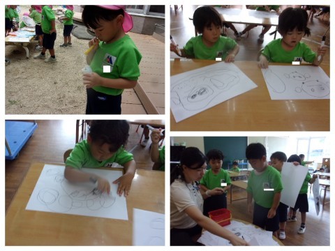 部屋に帰ってから,シャボン玉遊びの様子を絵にかいてみました。