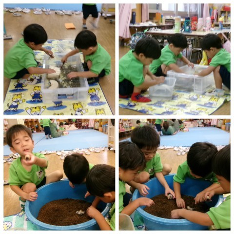 おやつの後は,ザリガニや カブトムシの幼虫のお世話をしました。