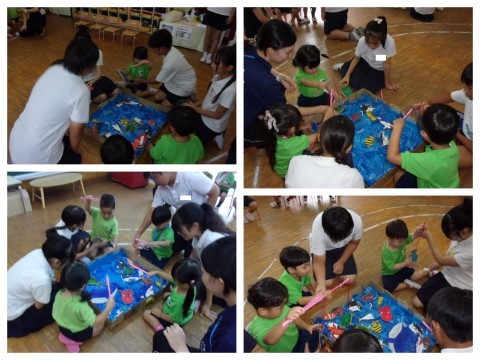うさぎ組では,6年生と一緒にじゃんけん列車と魚釣りをしました。