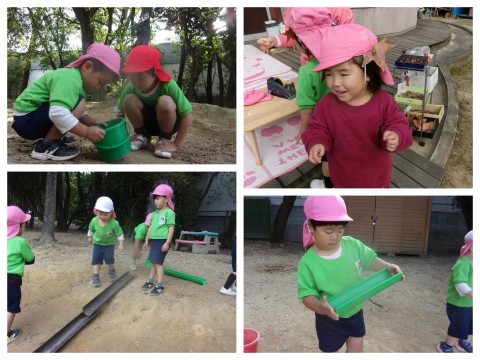 頭にはっぱをつけて変身したり,どんぐりころがしのコースを友達とつくったりして楽しんでいます。