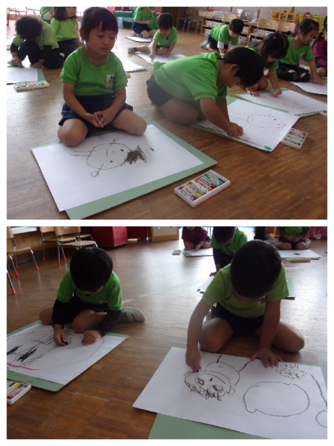 室内では、昨日の園外保育の思い出を絵で描きました。