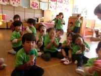 今日は昨日つくったアイスにトッピングをしたり,コーンをつくったりして遊びました。