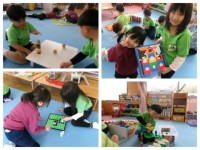 お部屋に戻って、カラーポリ袋を使ってオリジナルの素敵な凧をつくって上げている子どもたちもいました♪