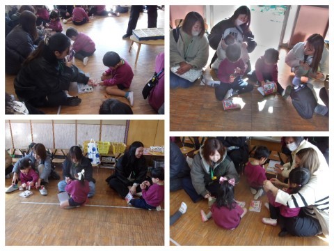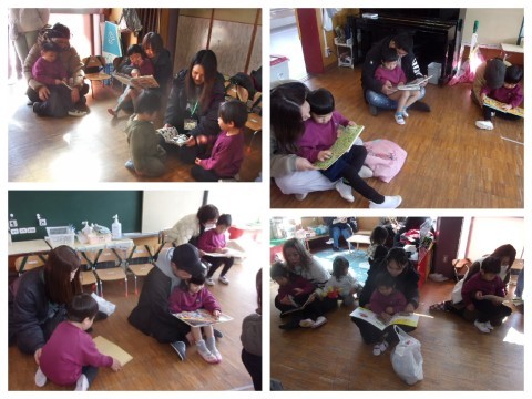 おひざ絵本では、おうちの人のおひざに座らせてもらったり、そばにぴったりくっついて絵本を読んでもらいました。