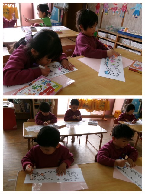 線からはみ出さないように、丁寧に塗り進めることを頑張っていました♪