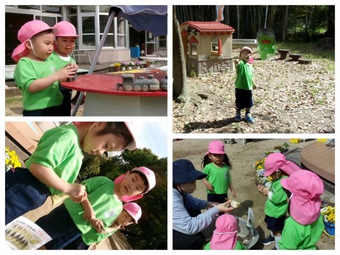 戸外遊びで、たけのこの皮をむいてにおいを嗅いだり、皮を小さくちぎったりと