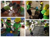 砂に水を混ぜるのがとにかく楽しくて「コーヒーだよ」「どうぞ」「カレーライスができたよ」と色や形の変化を楽しんでいました。