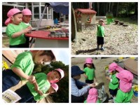 砂場のお家ではレストランごっこです。このレストランはバイキング形式で、お客さんがお皿を持って行くとお料理をのせてくれます。子どもたちの経験が遊びに生かされていることを改めて感じました。