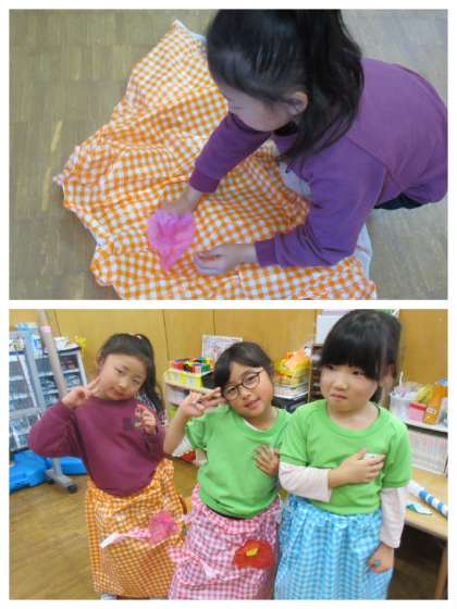 こどもまつりのおもちゃの解体をし、テーブルクロスで使われていたビニール袋をリサイクルしてスカートを作ったお友だちがいました。お花紙もリサイクルして、かわいいお花を作り、それをスカートに飾り付けていましたよ。素敵なスカートができあがりましたね!